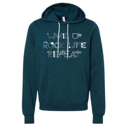 Flat lay of Atlantic blue Adventure in Every Letter hoodie from the Wake Up. Rock Life. Repeat. Collection, featuring playful kayak, fishing pole, and tent—nature-inspired outdoor lifestyle gear Flat lay of Atlantic blue Adventure in Every Letter hoodie from the Wake Up. Rock Life. Repeat. Collection, featuring playful kayak, fishing pole, and tent—nature-inspired outdoor lifestyle gear