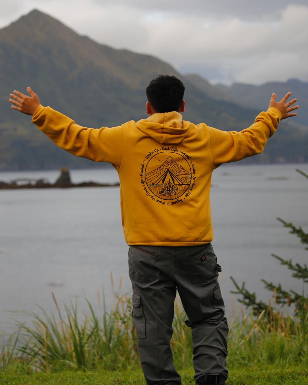 Smiling youth wearing a heather mustard Campfire Nights full zip hoodie with Rock Life logo, standing outdoors with mountains in the background, cozy camping apparel Smiling youth wearing a heather mustard Campfire Nights full zip hoodie with Rock Life logo, standing outdoors with mountains in the background, cozy camping apparel